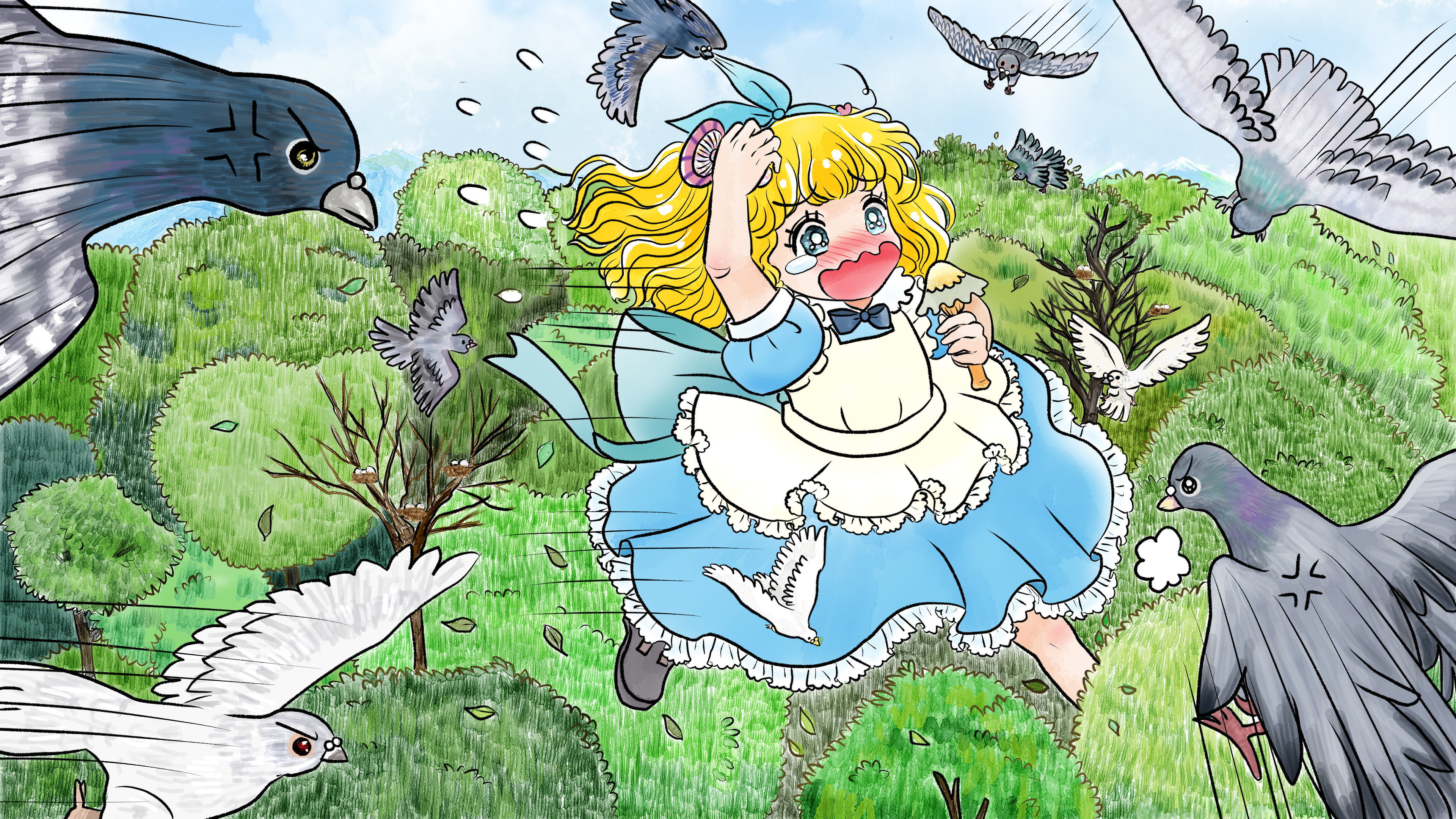 ハトは再び、アリスの頭を突きます。