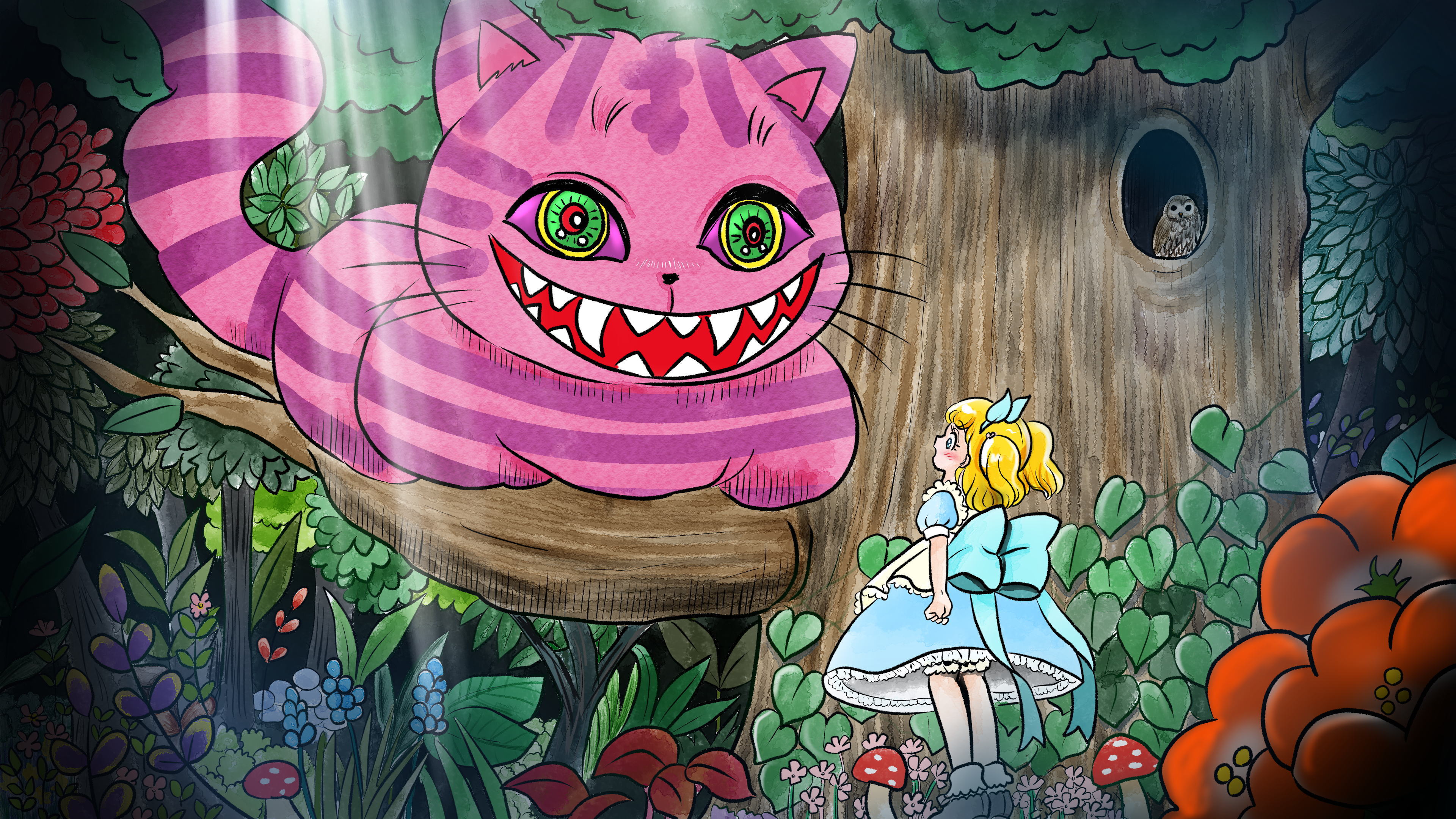 大きくなるキノコと小さくなるキノコを交互になめながら、ちょうどいい大きさになったアリスは森の中を進みました。