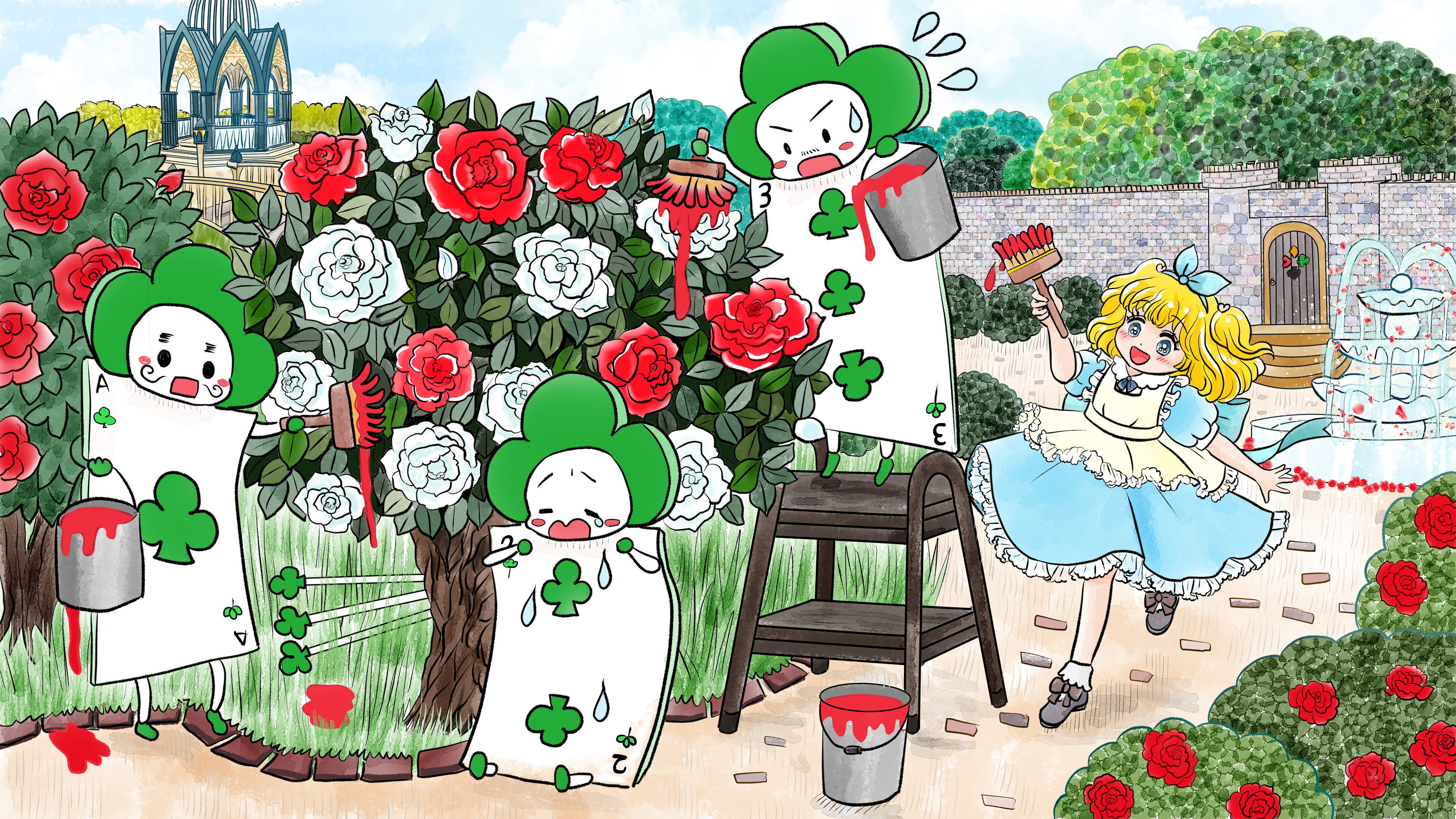 アリスは赤いペンキとハケを持つと、3人と一緒に歌いながら白いバラを赤くぬりはじめました。