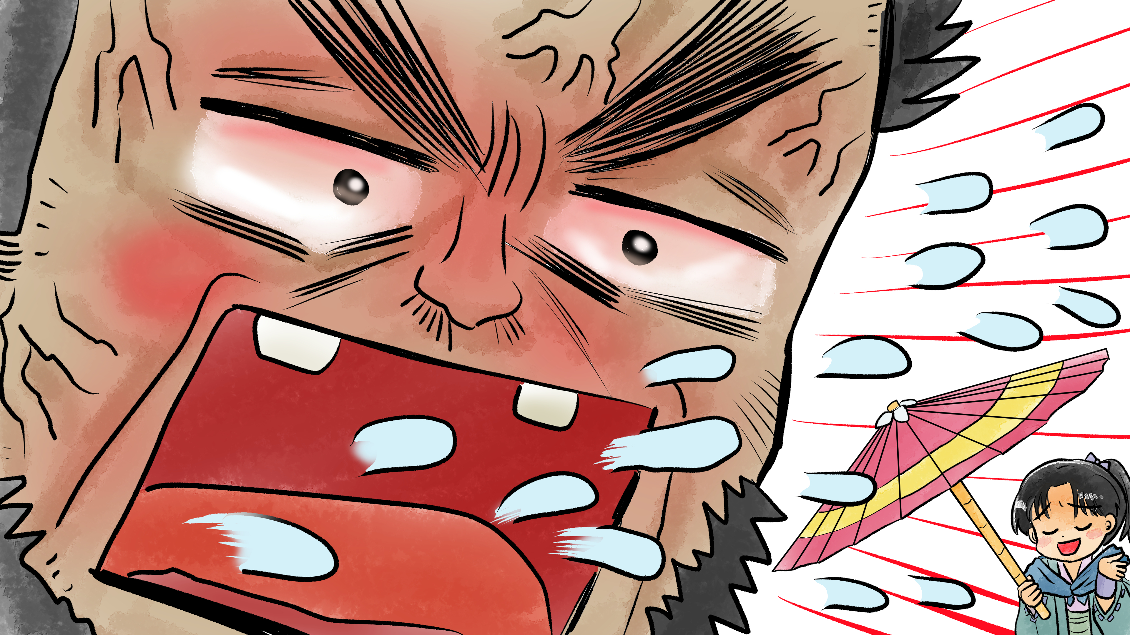 「ば、ば、ばかにするな! た、た、たかが紙きれ、一刀のもとだ。そうじゃ、ついでにお前も、まっぷたつにしてやるぞ。かくごはよいか!」