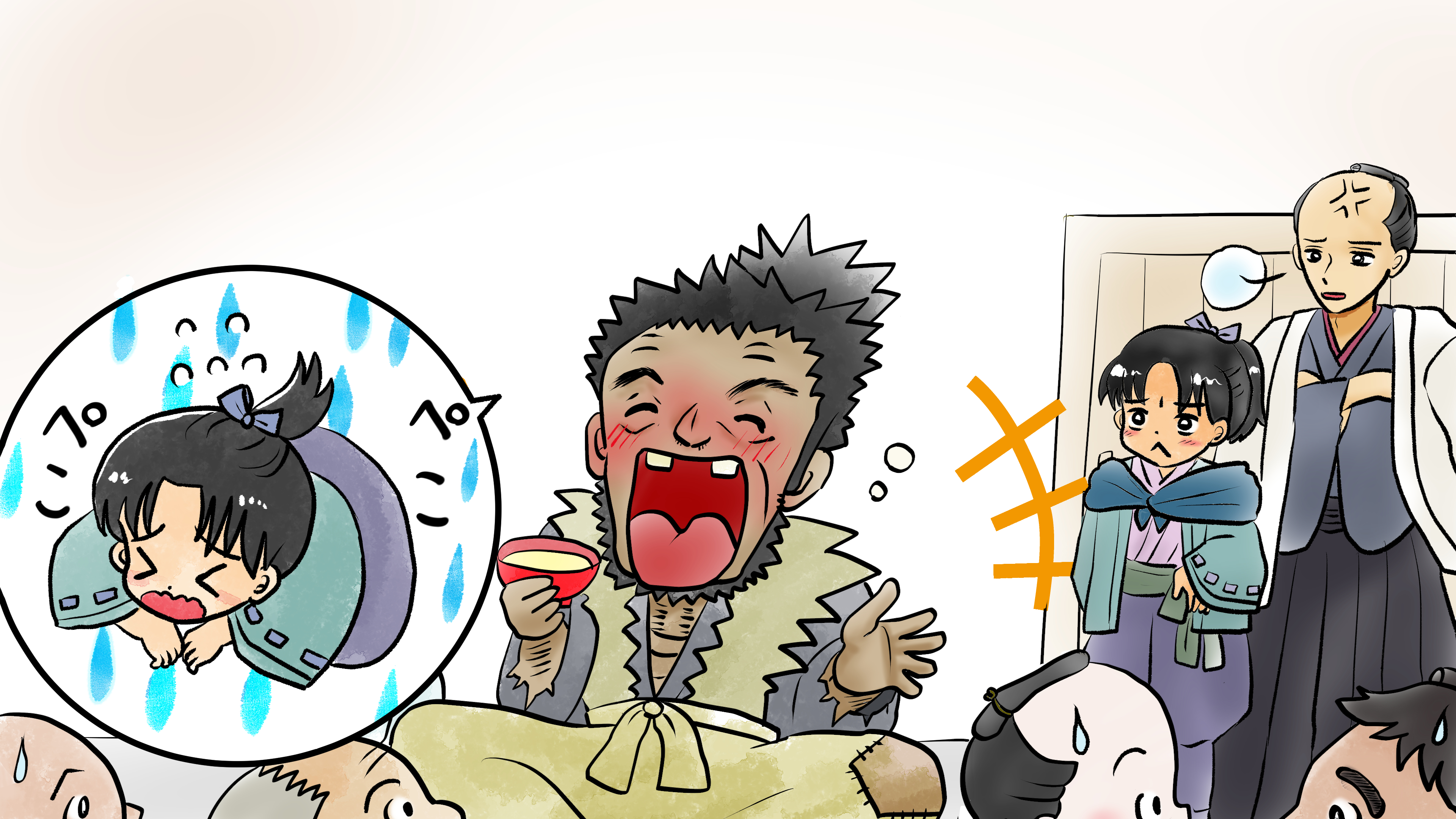 と、ぶしょうひげを生やした身なりの悪い浪人(ろうにん)が、酒をあおりながら得意になってしゃべりまくっています。