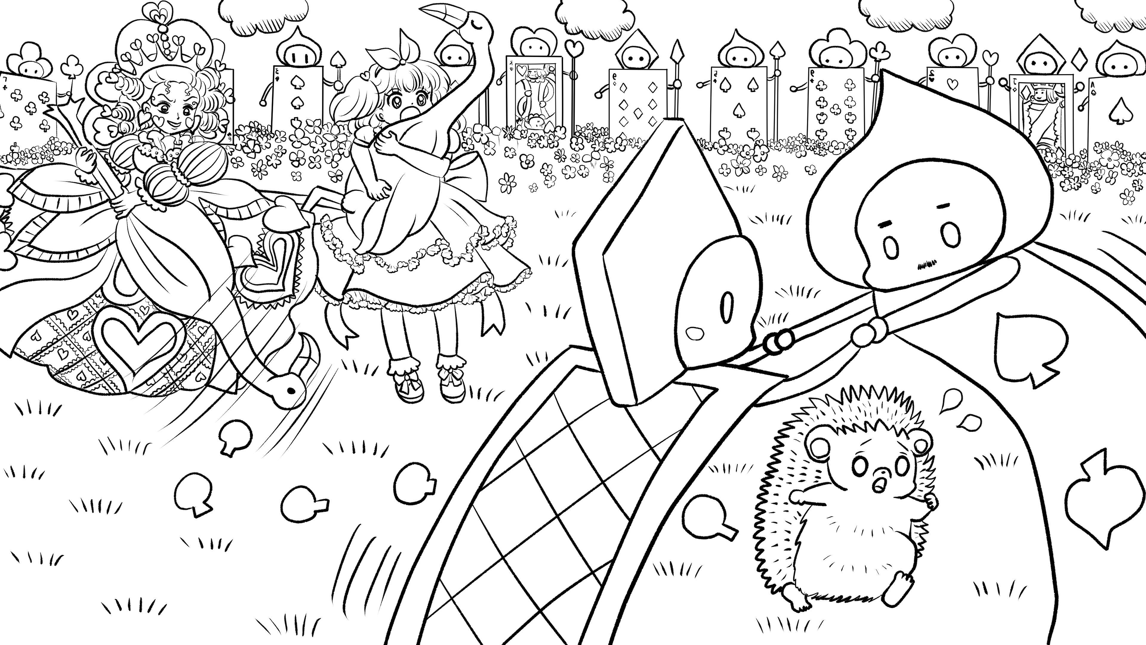 女王はクロッケーが下手で、ハリネズミのボールはとんでもない方向へ転がっていきましたが、ゲートの代りをしているトランプたちが急いで動いて、ハリネズミのボールを自分たちの体で作ったゲートに通しました。