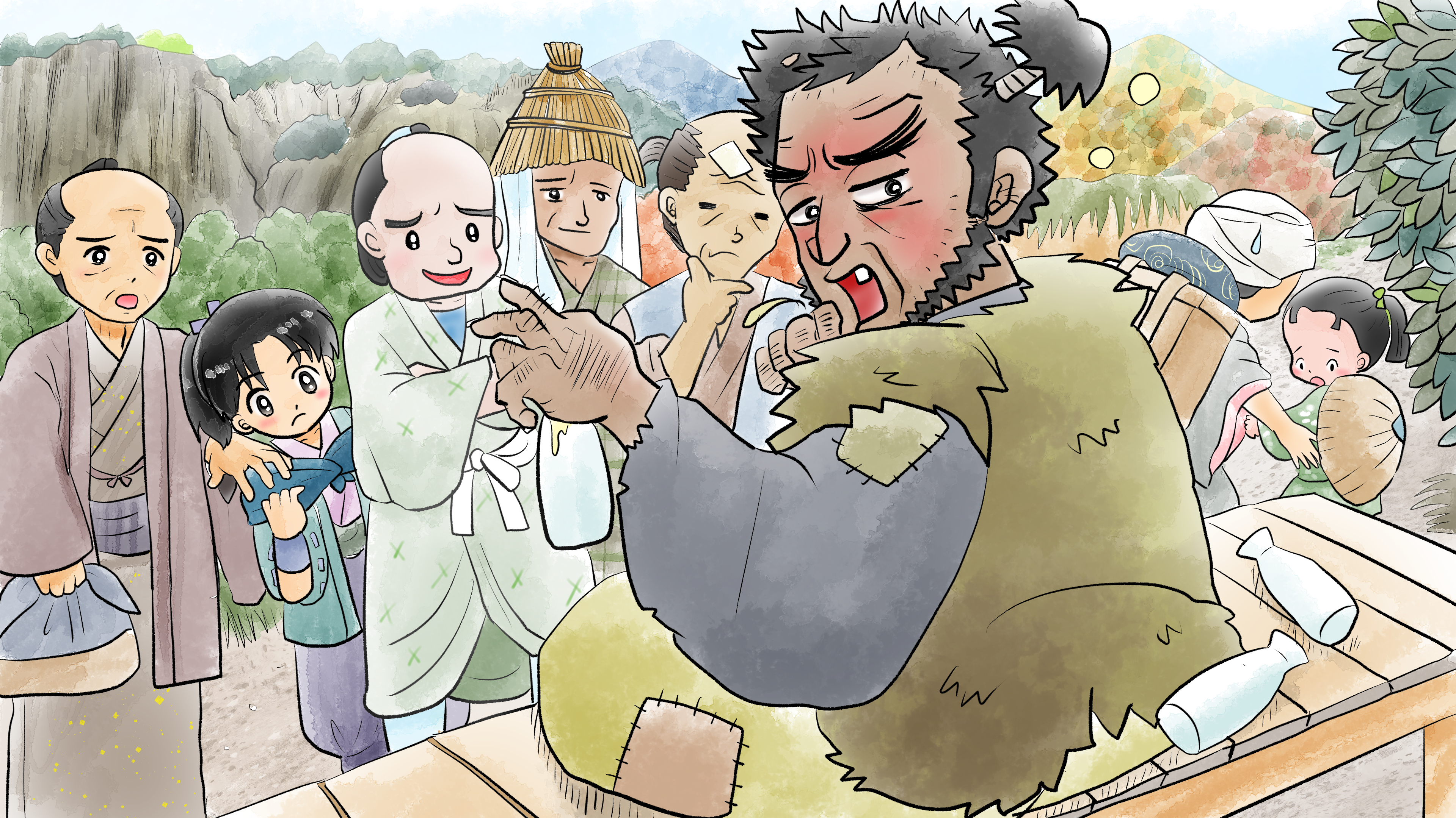 と、ぶしょうひげを生やした身なりの悪い浪人(ろうにん)が、酒をあおりながら得意になってしゃべりまくっています。