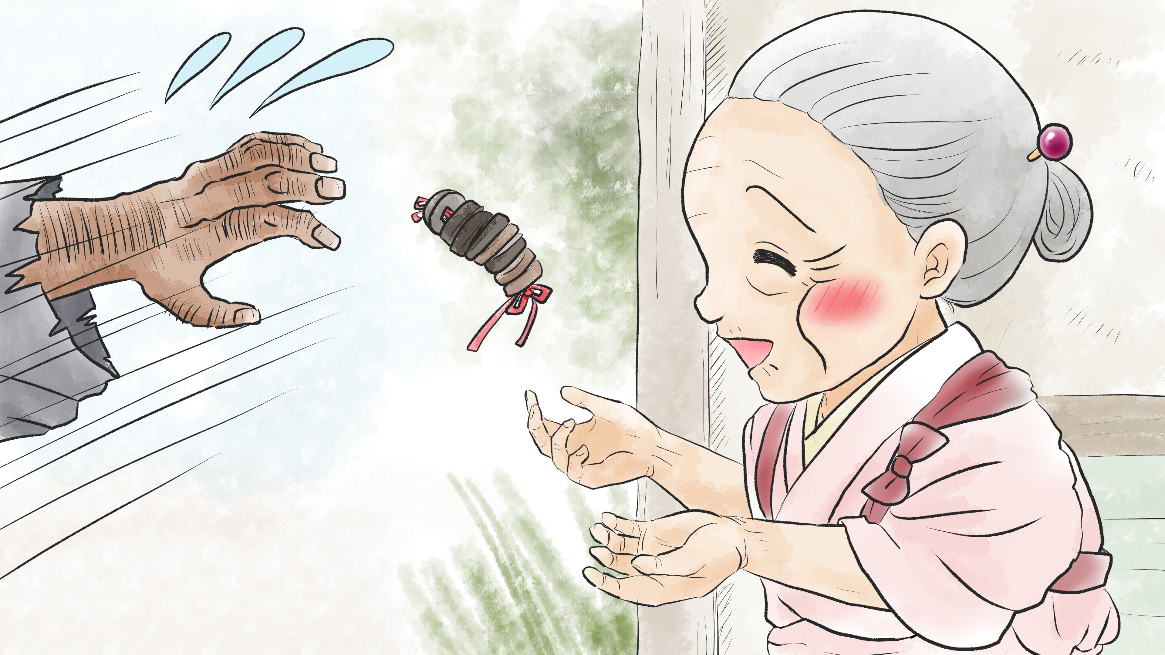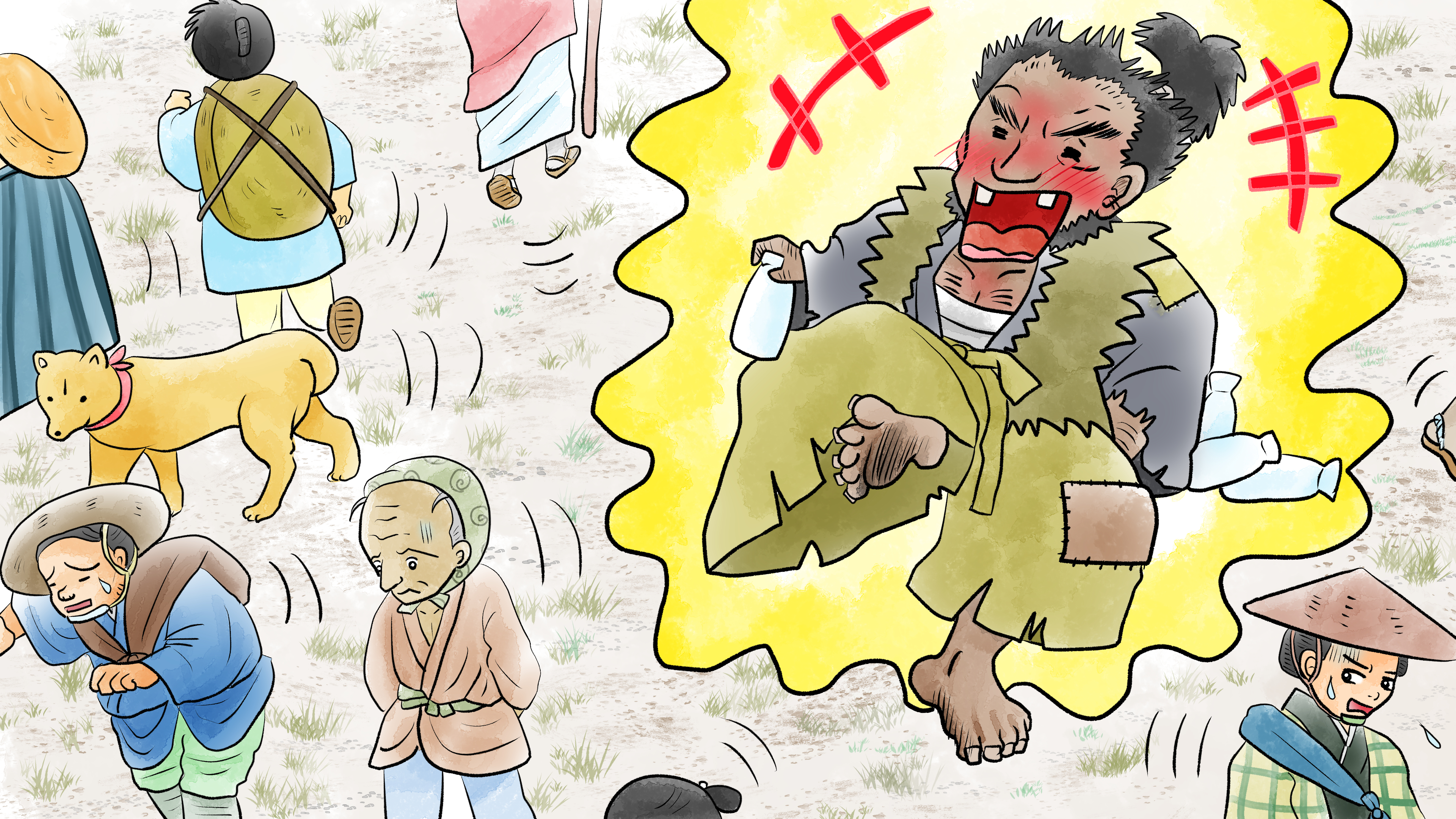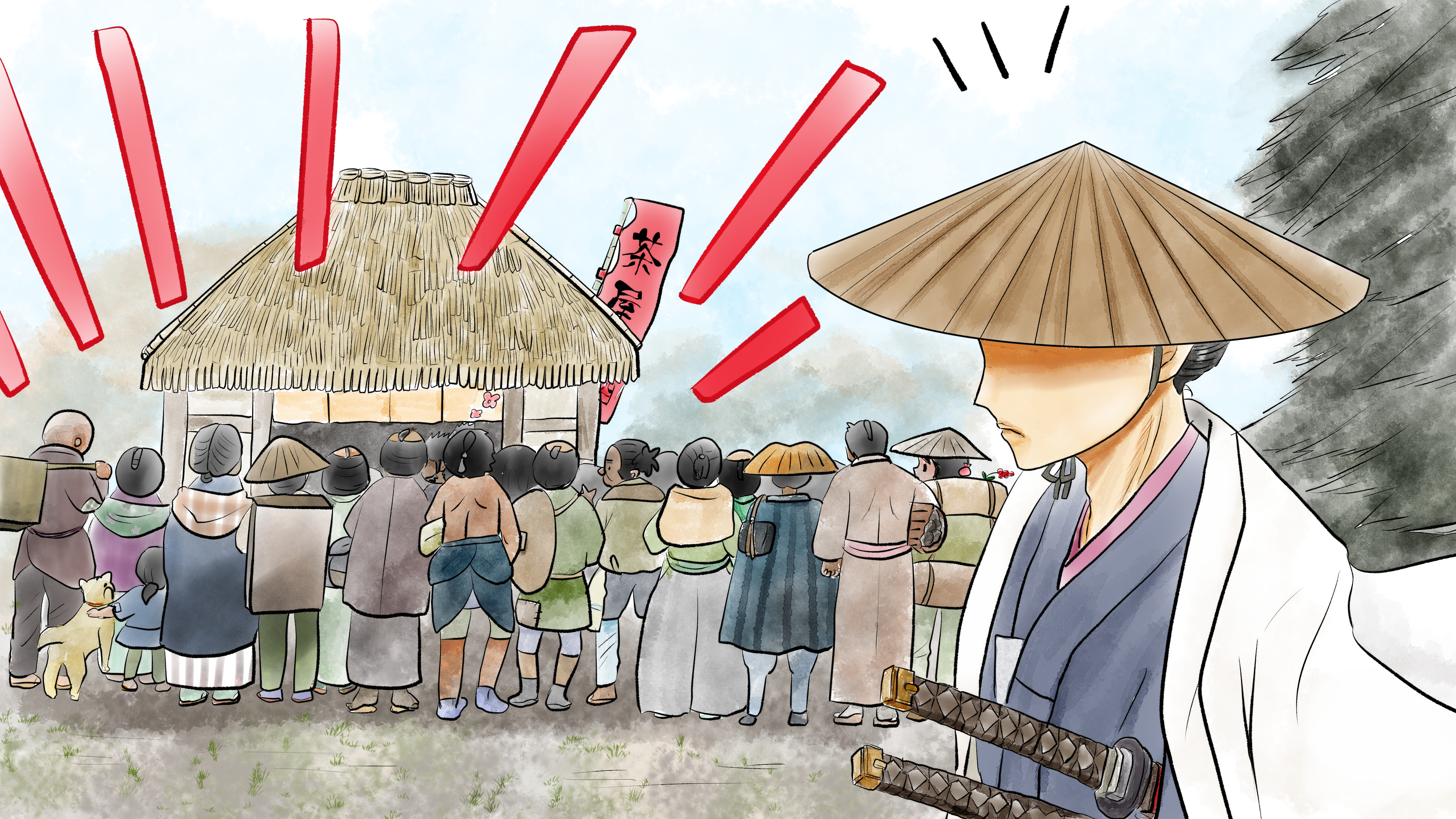 浪人は茶店のおばあさんをつきとばすと、勝手に店の酒を飲みはじめました。