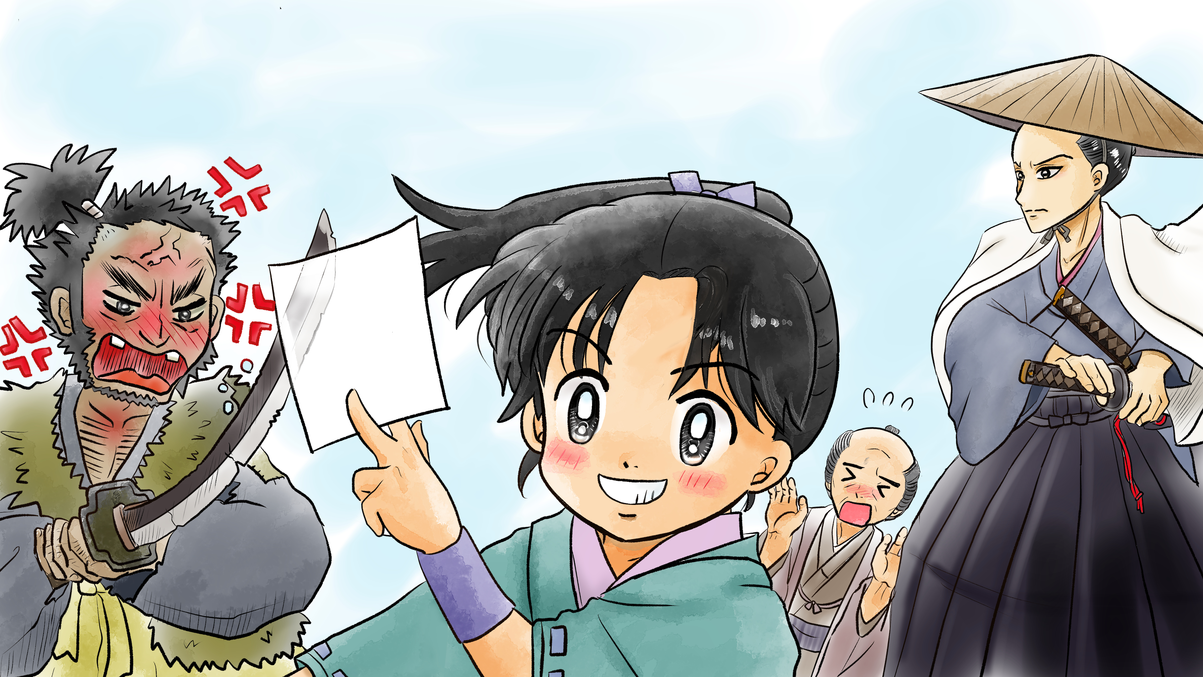 「ば、ば、ばかにするな! た、た、たかが紙きれ、一刀のもとだ。そうじゃ、ついでにお前も、まっぷたつにしてやるぞ。かくごはよいか!」
