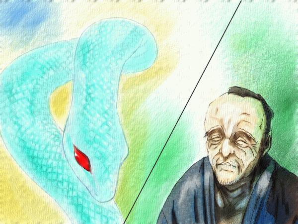 みんなが一心にお参りしていると葉っぱだらけの小さな池の水がごうごうと動き出して、中から池の主の大蛇が姿を現しました。