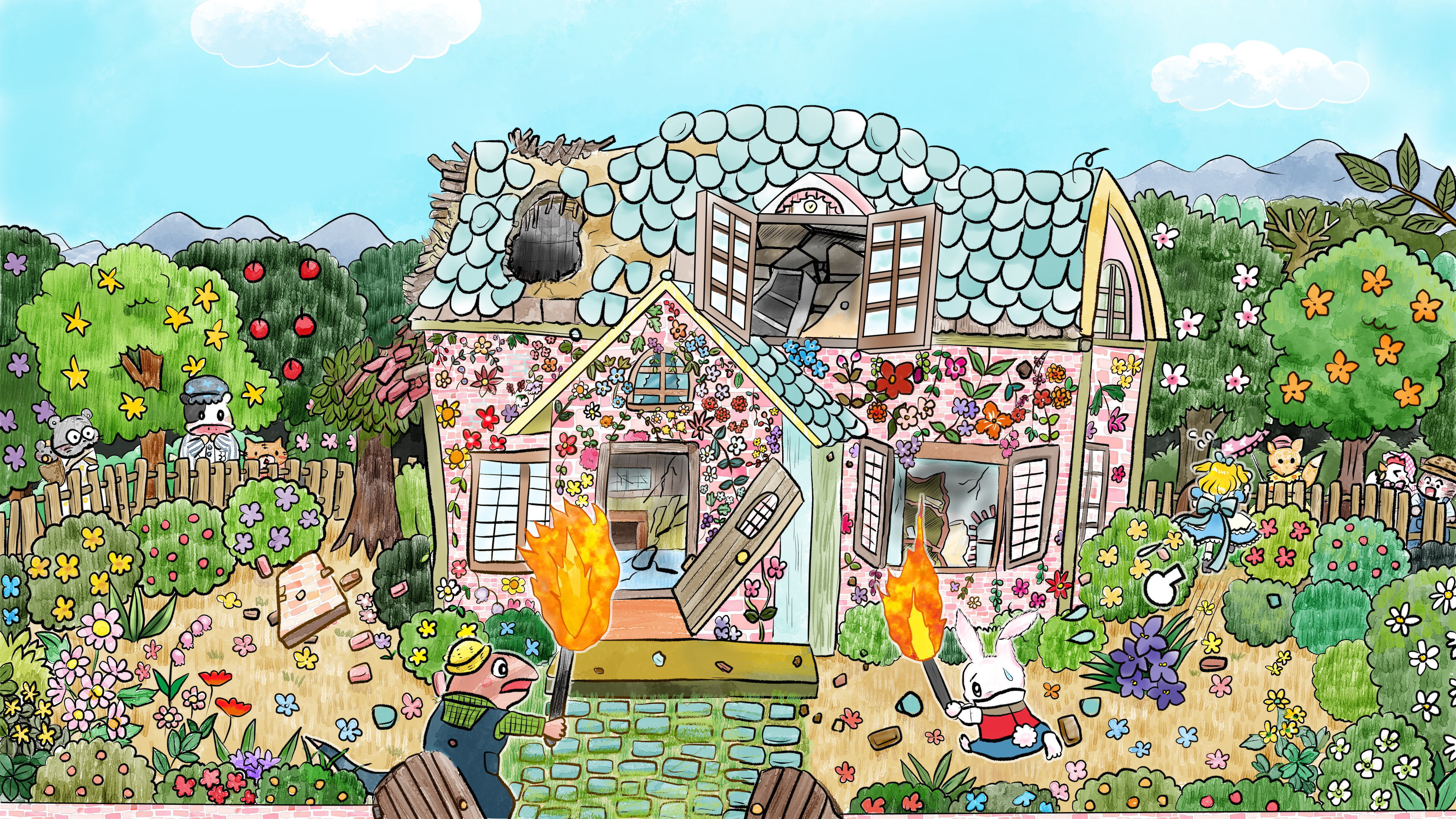 外に出ると白ウサギとトカゲの庭師が、家に火をつけようとしています。