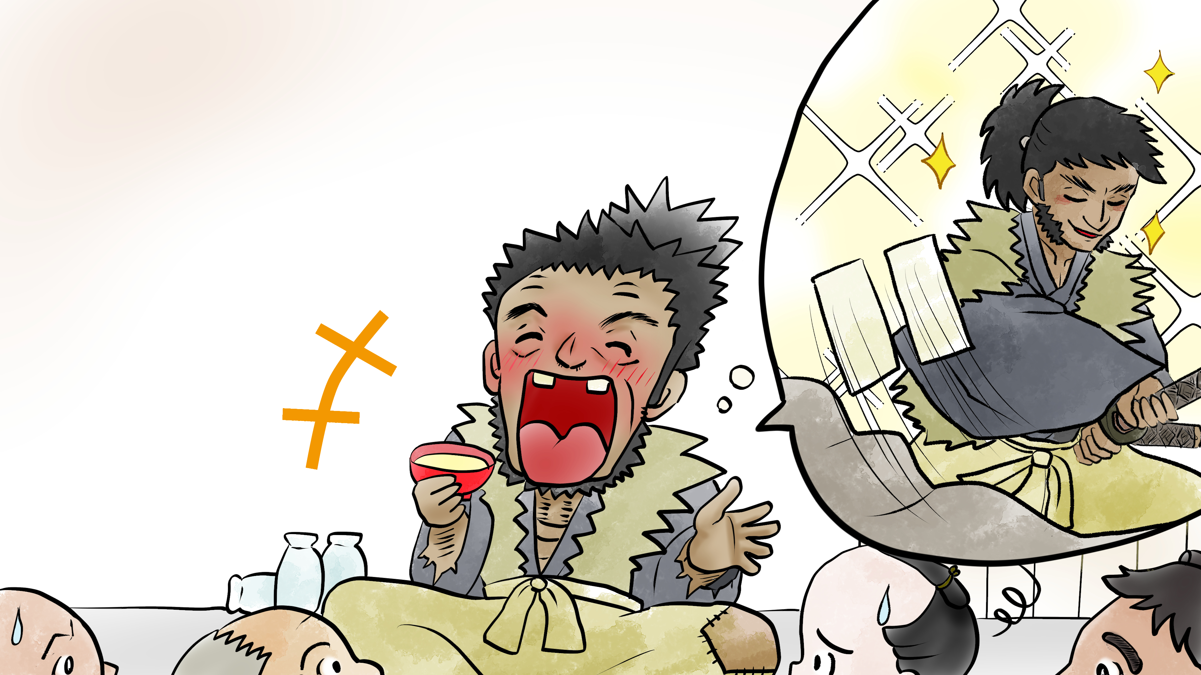 と、ぶしょうひげを生やした身なりの悪い浪人(ろうにん)が、酒をあおりながら得意になってしゃべりまくっています。